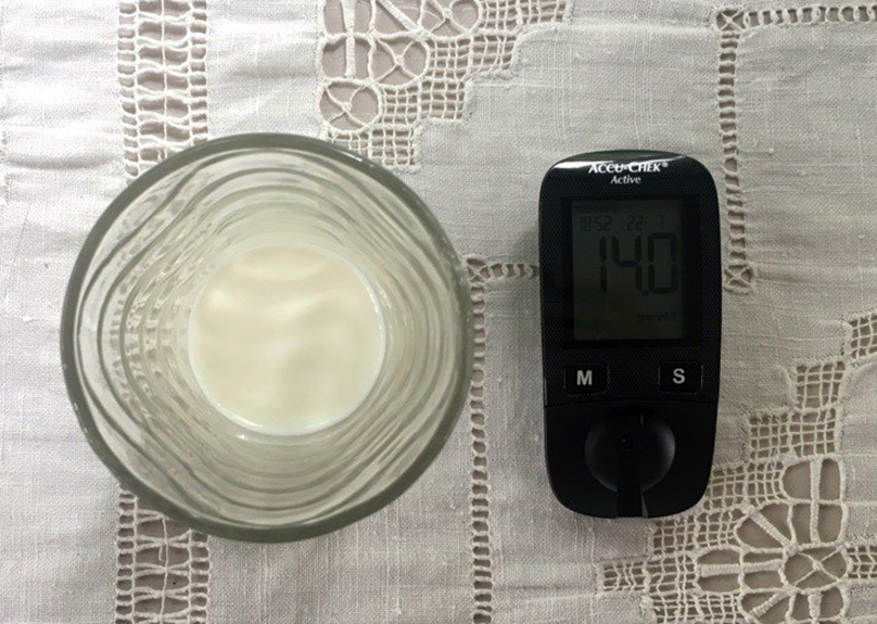 Или вот я шутки ради опустила палец в молоко и высушила его - визуально палец как палец, никаких следов преступления. Между измерениями, описанными выше, прошло не более минуты. Позволю себе напомнить, что диабета у меня нет.
