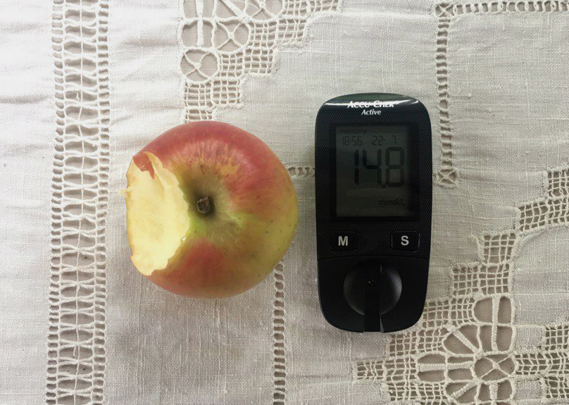 И если предыдущие показатели вас удивили (меня - очень!), то взгляните на тот апокалипсис, который сотворило с моим "уровнем глюкозы" невинное яблоко. Стоило только тыкнуть пальцем в огрызок, а потом этим пальцем - в тест полоску. Нет, у меня правда нет диабета.