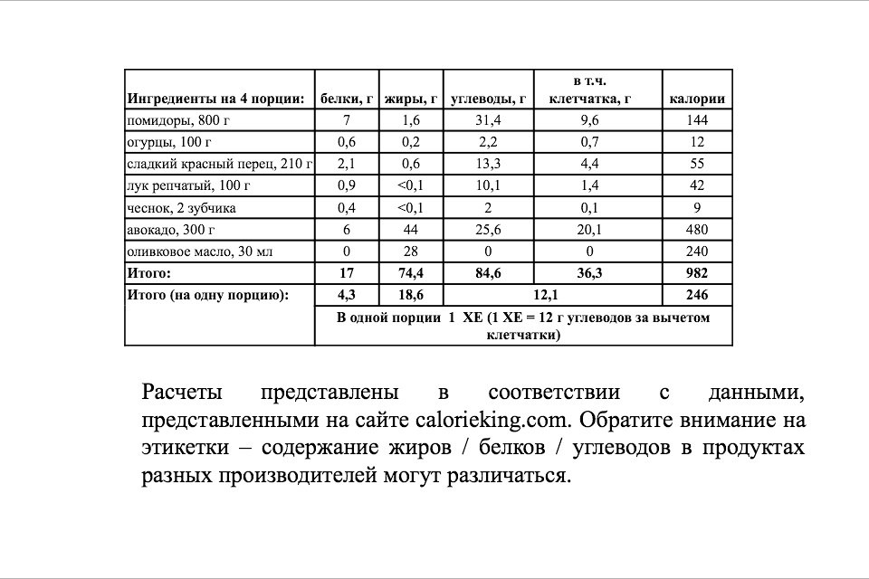3. Подаем суп холодным с нарезанным кубиками авокадо и, по желанию, кусочком цельнозернового хлеба (расчет его ХЕ не включен)