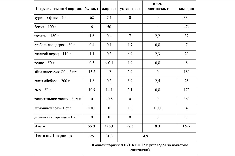 a) салат богат белками и жирами (за счет куриного мяса, бекона, яиц и сыра) – не забывайте про белково-жировую единицу, и, если вы учитываете белки и жиры при расчетах, обратите, пожалуйста, внимание на их количество в данном блюде;