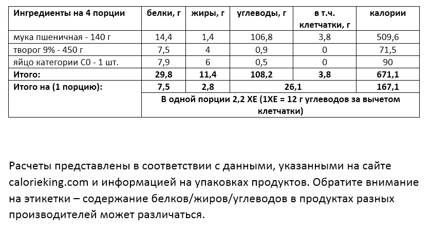 В одной порции*: 168 ккал, белки – 7,5 г, жиры – 2,8 г, углеводы – 27,0 г (в том числе клетчатка – 1,0 г).