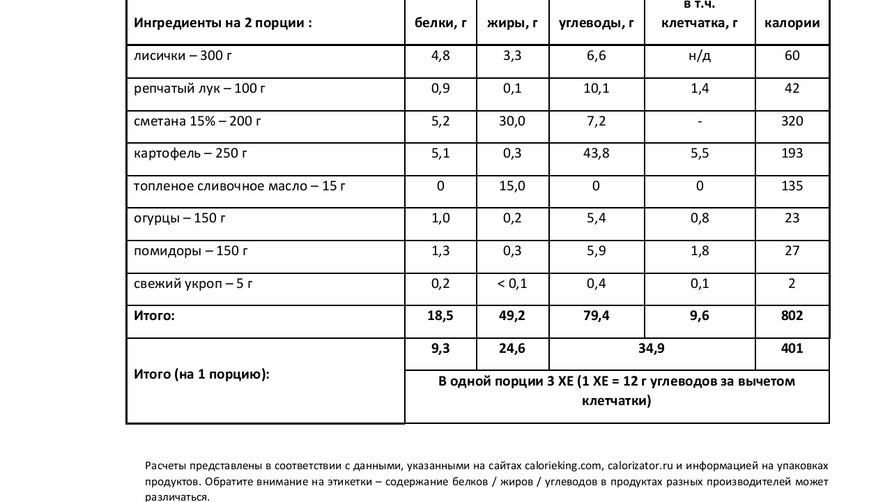 Во-вторых, гарнир. Картофель, кажется, просто идеально сочетается с лисичками в сметане, но это неоднозначный продукт, так как его гликемический индекс существенно различается в зависимости от способа приготовления и температуры при подаче (более подробно об этом можно прочитать тут). Поэтому картофель в мундире целиком или даже жареный (ведь масло снижает время всасывания и переваривания) – удачные варианты при учете размера порции картофеля и того, с чем вы блюда из картофеля сочетаете.