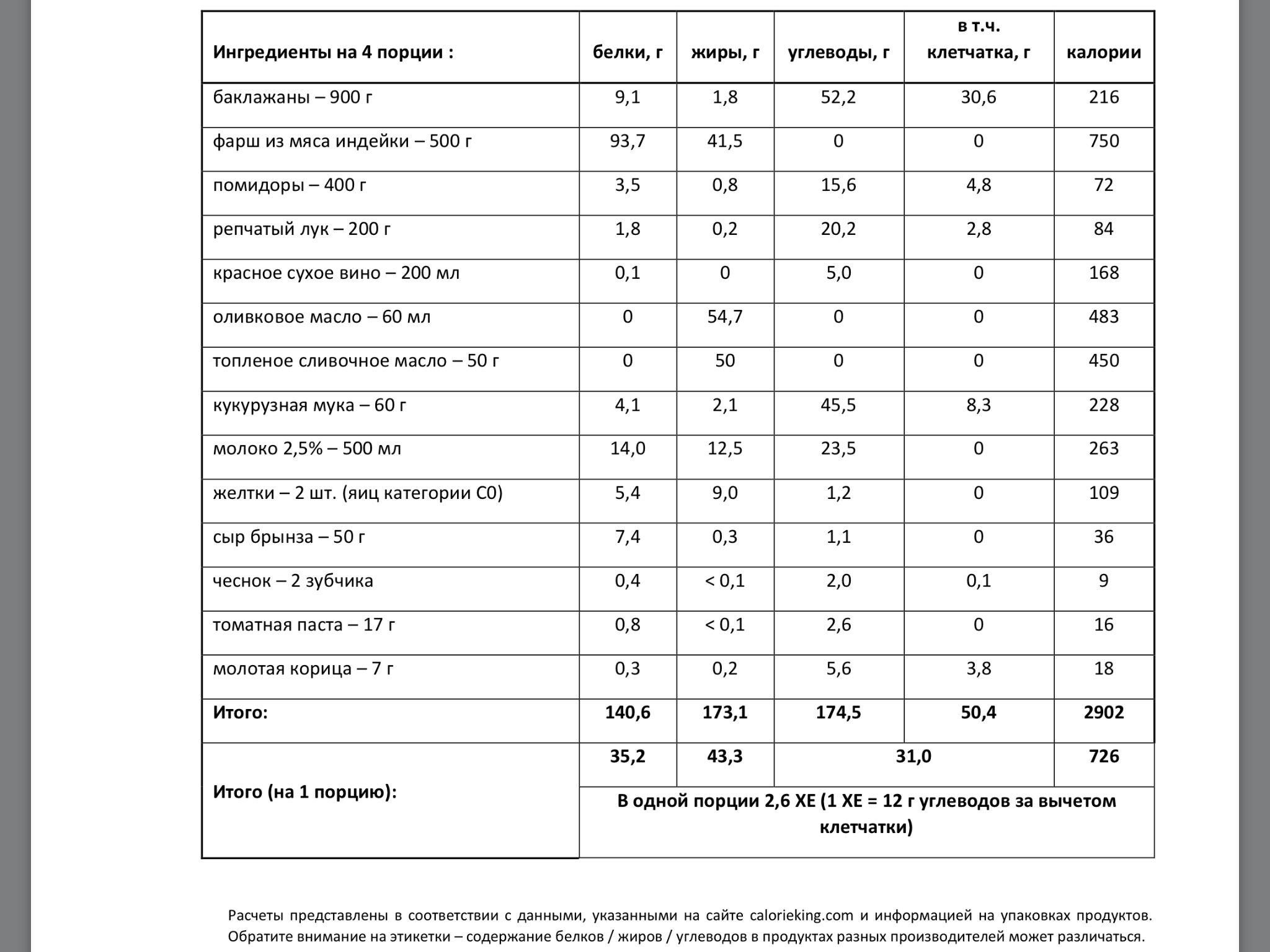 В одной порции: 726 ккал, белки – 35,2 г, жиры – 43,3 г, углеводы – 43,6 г (в т.ч. клетчатка – 12,6 г).