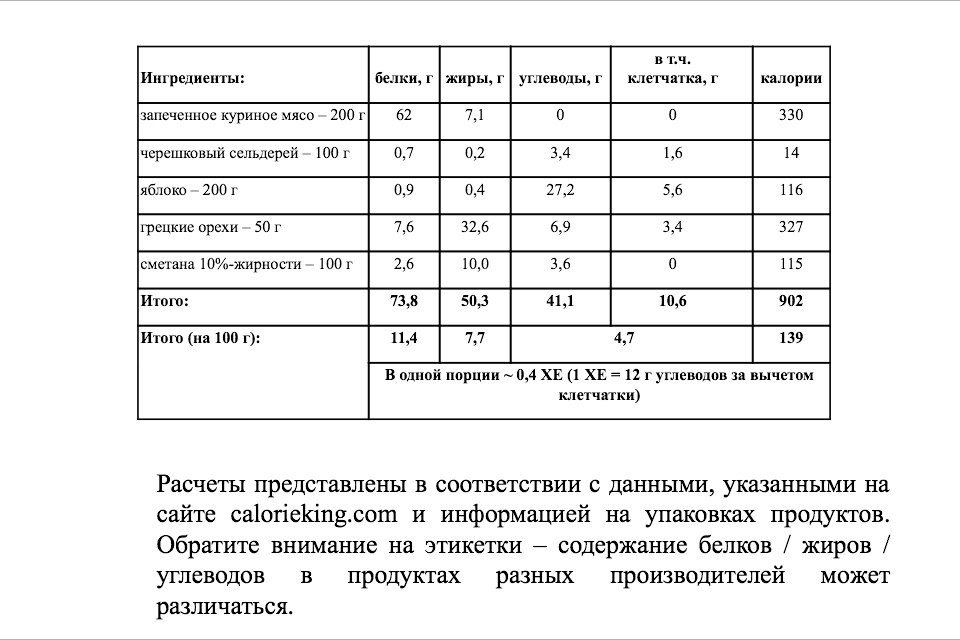 *Расчеты представлены в соответствии с данными сайта calorieking.com и информацией на упаковках продуктов. Обратите внимание на этикетки  содержание белков, жиров и углеводов в продуктах разных производителей может различаться.