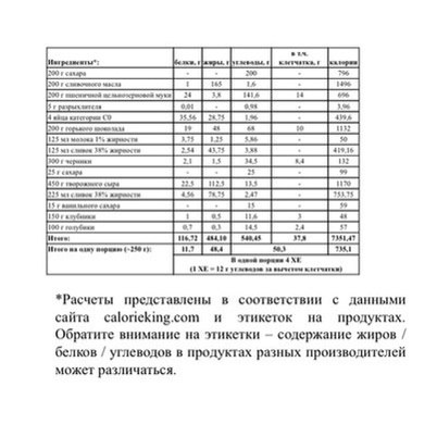 На самом деле торт получается очень большой (по 260 г в кусочке), так что целого торта легко хватит и на 15 человек по 150 г и 3 ХЕ в одной порции.