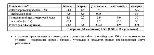 В порции (5-6 сырников) = 2 ХЕ (1 ХЕ = 12 г углеводов)