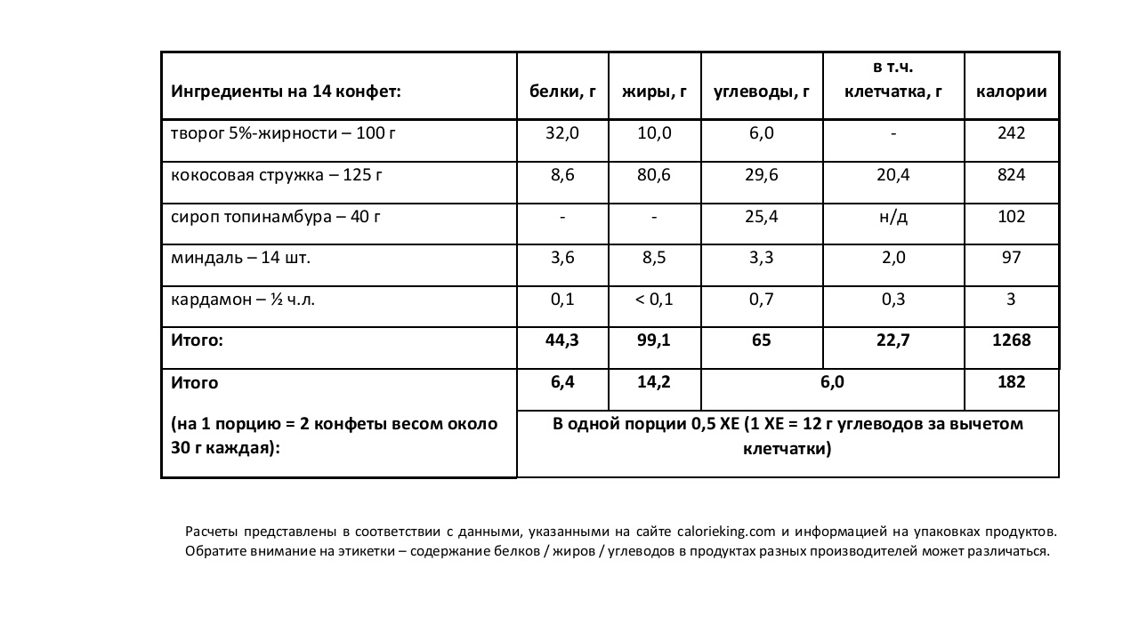 (в одной порции – 2 конфеты весом около 30 г каждая)