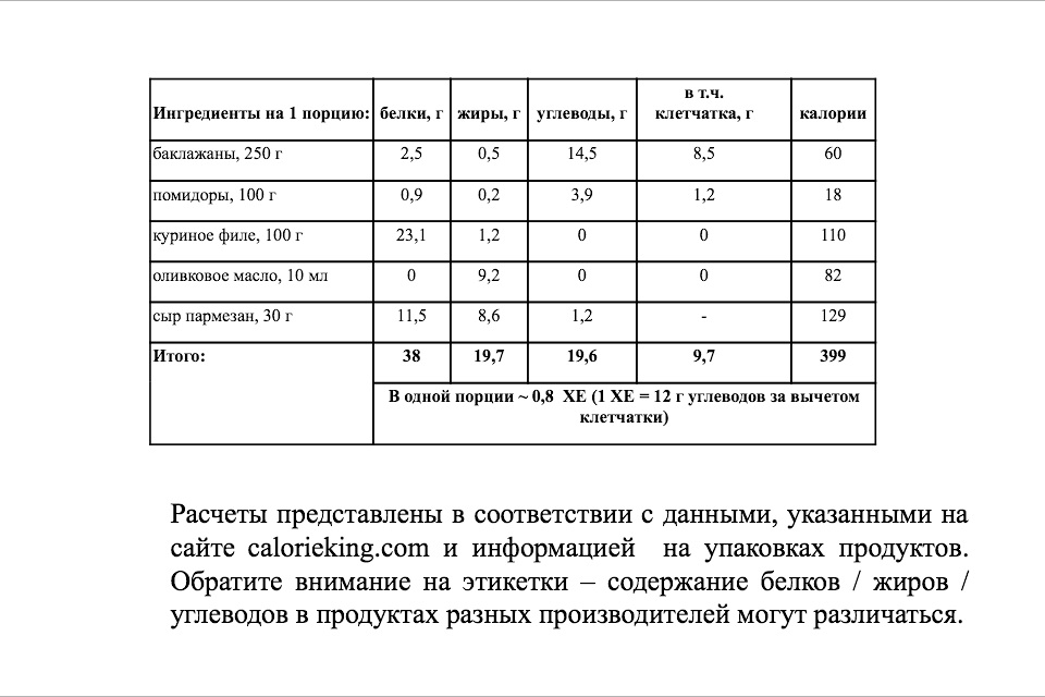 В одной порции: 399 ккал, белки – 38 г, жиры – 19,7 г, углеводы – 19,6 г (в том числе клетчатка – 9,7 г).