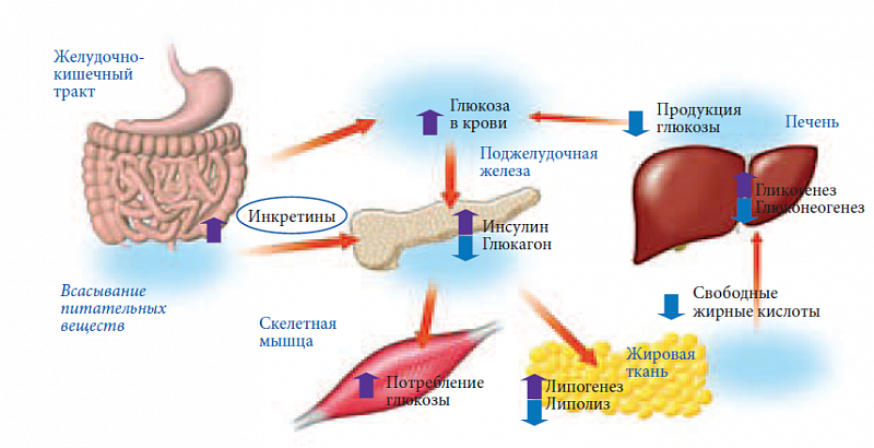 ГПП-1 снижает образование глюкозы из жиров и белков в печени, способствует «захвату» глюкозы из крови клетками мышц и печени.