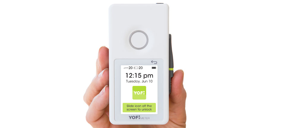 Результат объединения двух американских компаний, необычный YoFiMeter имеет две встроенные кассеты: одну с 20 тест-полосками (каждая полоска примерно в половину короче обычной, потому что состоит только из той части, на которую наносится кровь) и вторую – с 20 ланцетами, и 3 кнопки – одна активирует всю систему, вторая – заставляет ланцет выстреливать, а третья нужна, чтобы избавиться от использованной тест-полоски. У девайса также есть цветной сенсорный экран, возможность ведения электронного дневника и записывающее устройство (встроено в прибор), с помощью которого можно записывать голосовые сообщения.